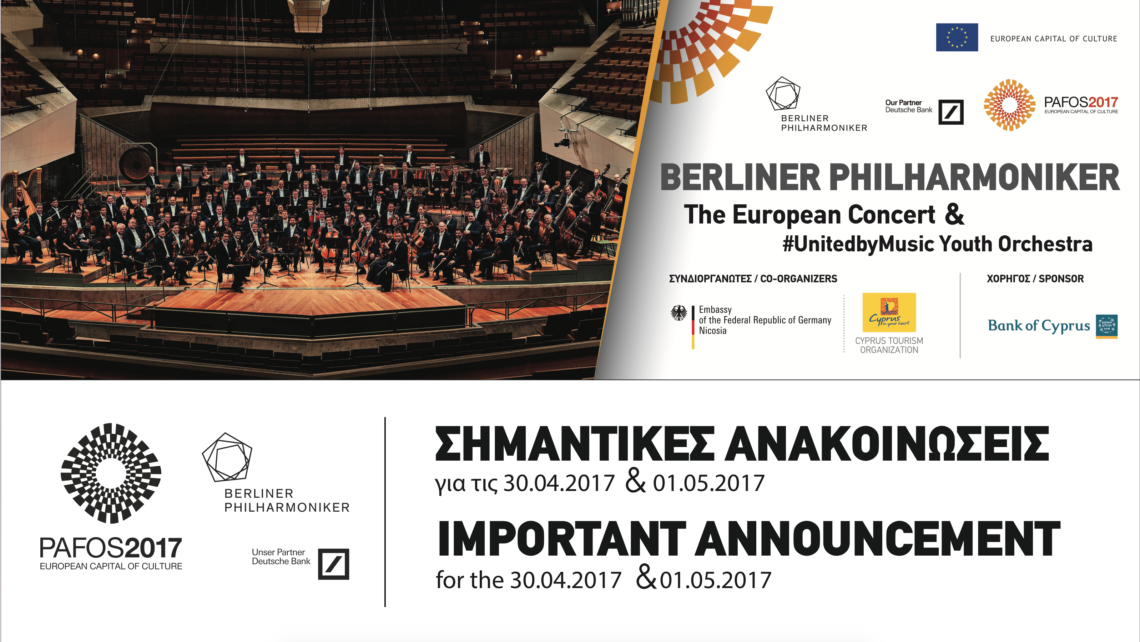 *Το Κονσέρτο της Ευρώπης της Φιλαρμονικής του Βερολίνου είναι μια διοργάνωση της Πολιτιστικής Πρωτεύουσας της Ευρώπης – Πάφος2017 με συνδιοργανωτές την Πρεσβεία της Γερμανίας στη Λευκωσία, τον Κυπριακό Οργανισμό Τουρισμού και Χορηγό την Τράπεζα Κύπρου.